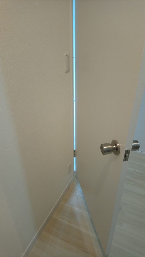 この部屋に入って照明をつけるには入口のドアを回って、手を伸ばしてスイッチを入れる必要があるんです。