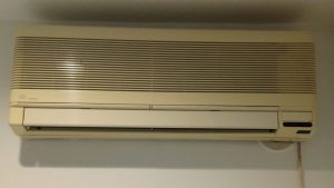 今回契約したペット可物件の紹介でも書いたんですが、黄ばんだエアコンはリモコンが見当たらず、コンセントを入れたら異音を発生させながら、動作し始めましたがしばらく置いても異音が鳴り続けるので、使えない消火器とともに撤去してもらいました。