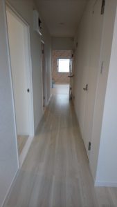 玄関を入るとまっすぐに廊下が伸びていて、右手にトイレ、洗面・風呂場があり、廊下正面にリビングダイニングがあります。