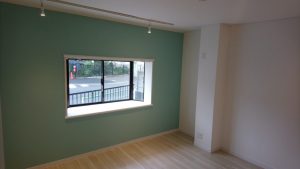壁の1面だけが淡いグリーンの壁紙になっていて今風のデザインです。
