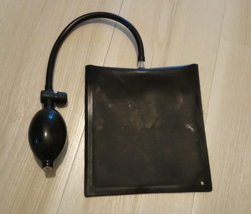 四角いのをドアの下に挟み、ポンプで空気をシュポシュポと入れると膨らみドアを持ち上げてくれます。