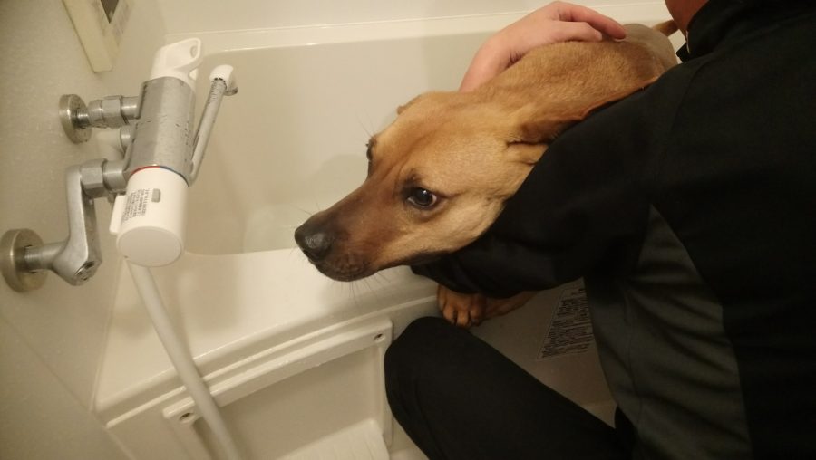 バスタブに入れると逃げ出そうとするので、抑えながらなんとか肩から後ろを軽く洗う。