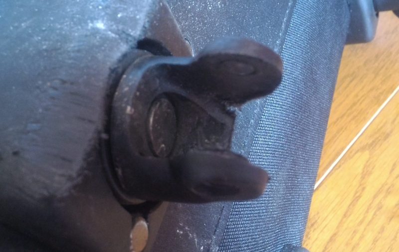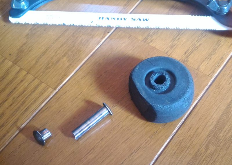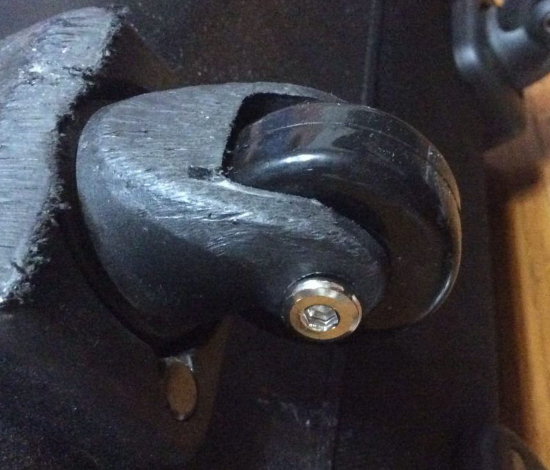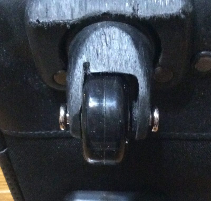 長年、出張や旅行に使ってきたソフトスーツケースの車輪。石でも詰まったのだろうか、回らなくなって一部だけすり減ってしまった。