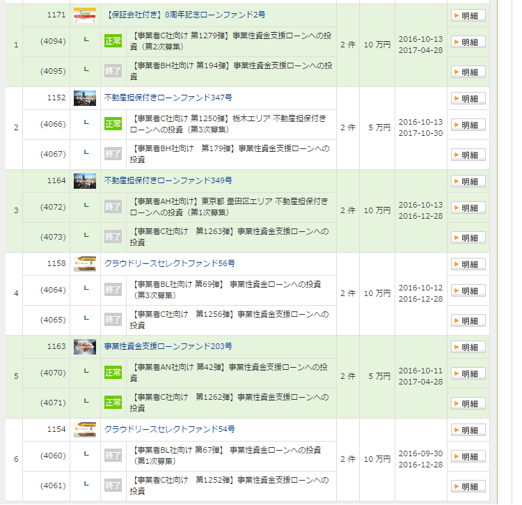 緑で「正常」と表示されているものが運用中で、「終了」と表示されているものが今回終了したローンファンドです。