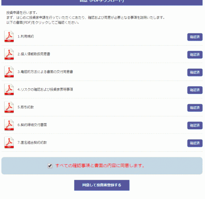 「すべての確認事項と書面の内容に同意します。」にチェックを入れ、同意して投資家登録するボタンを押します。