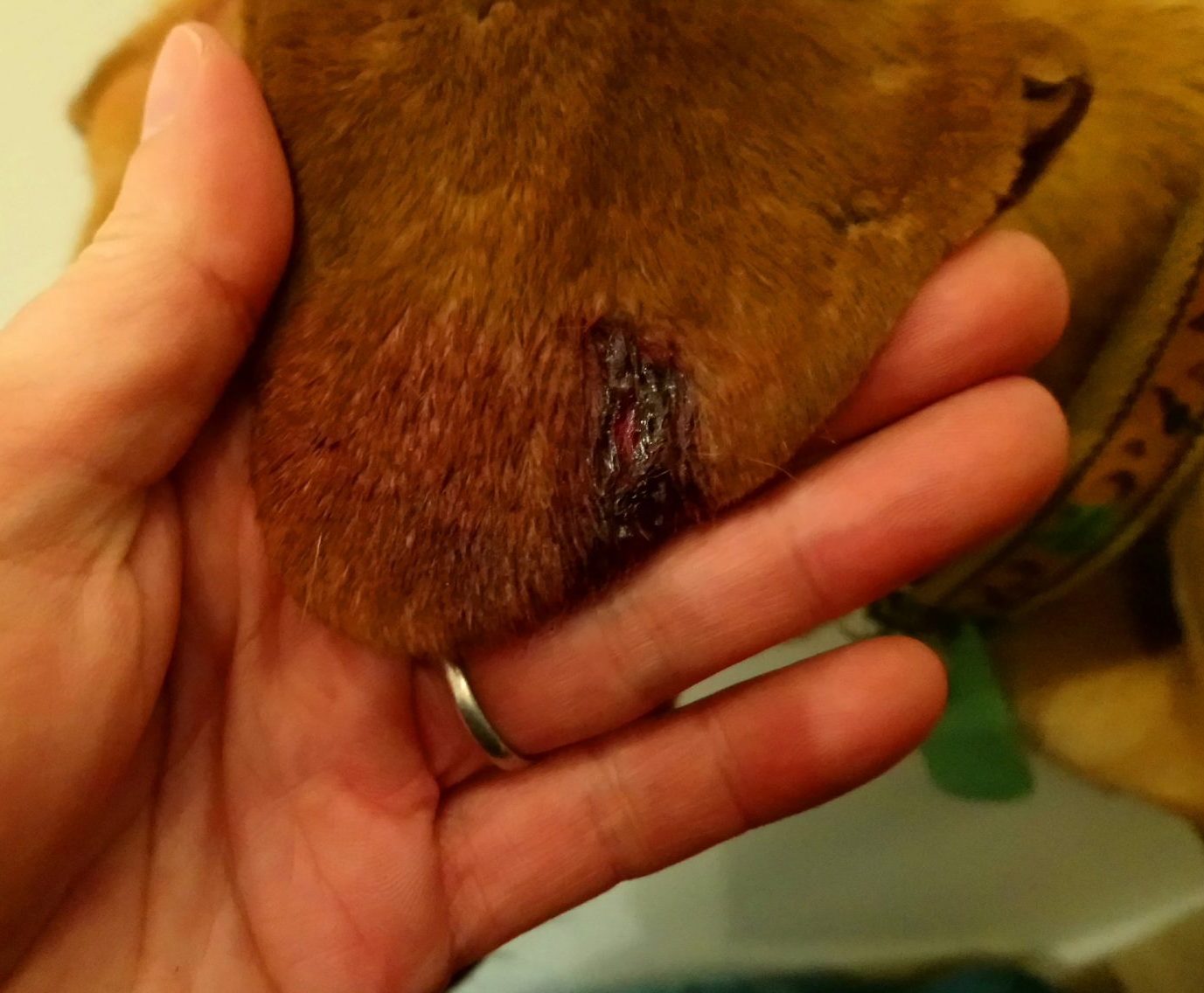 恐らく引き離すときに首輪やリードの金具かなにかにぶつけたのでしょう。